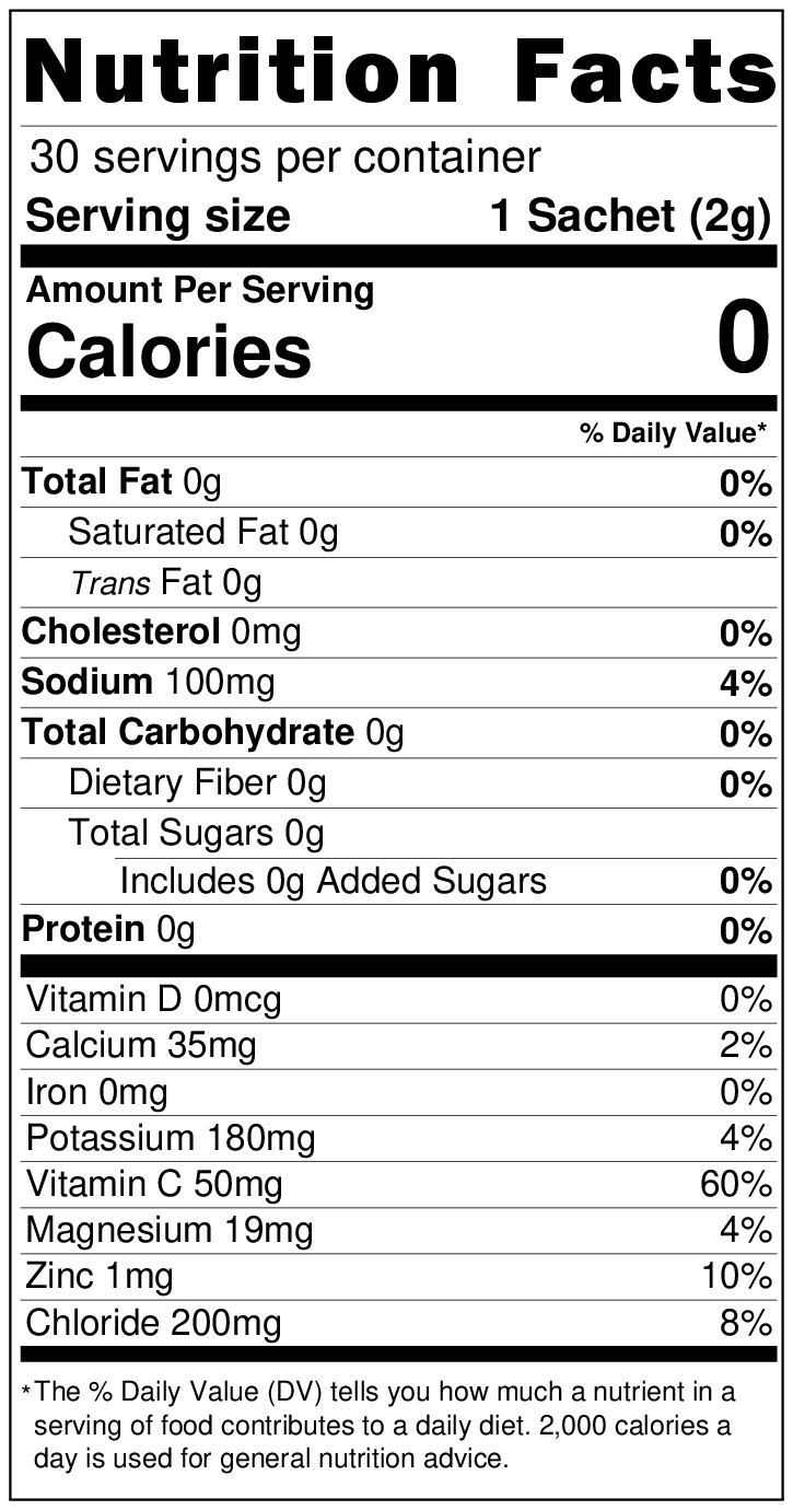 - Functional: Vitamin C, Zinc, Magnesium, Potassium, Sodium, Calcium & Chloride